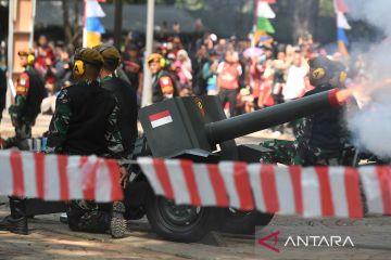 Personel Batalyon Armed 7 menembakan meriam 75 mm saat upacara Peringatan Detik-Detik Proklamasi Kemerdekaan ke-78 Republik Indonesia di halaman Monas, Jakarta, Kamis (17/8/2023). HUT ke-78 RI mengusung tema Terus Melaju Untuk Indonesia Maju. ANTARA FOTO/Hafidz Mubarak A/aww.