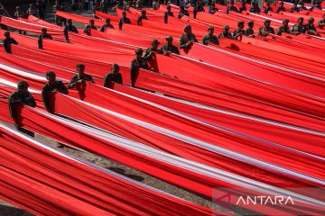 Sejumlah petugas membentangkan Bendera Merah Putih di Anjungan Pantai Losari, Makassar, Sulawesi Selatan, Kamis (17/8/2023). Pembentangan sebanyak 85 Bendera Merah Putih yang membentuk bunga rampai dengan rincian 78 bendera sebagai akar, dua bendera sebagai batang dan lima bendera sebagai bunga tersebut untuk memperingati HUT ke-78 RI. ANTARA FOTO/Arnas Padda/aww.