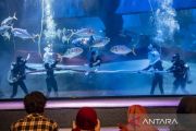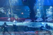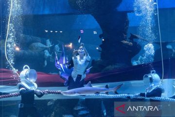 Sejumlah penyelam mengikuti lomba tarik tambang di bawah air di Jakarta Aquarium Safari, Kamis (17/8/2023). Lomba tersebut guna memeriahkan HUT Ke-78 Kemerdekaan Republik Indonesia. ANTARA FOTO/Muhammad Adimaja/aww.