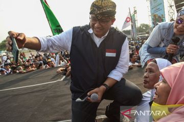 Bakal Calon Presiden Anies Baswedan berswafoto dengan relawan saat menghadiri deklarasi relawan Kuning Ijo Biru (KIB) di Lapangan PRPP Semarang, Jawa Tengah, Minggu (20/8/2023). Deklarasi yang dihadiri jajaran kader partai politik dari Koalisi Perubahan serta ratusan relawan KIB se-Jateng tersebut guna mendukung pemenangan Anies sebagai Presiden Indonesia periode 2024-2029. ANTARA FOTO/Makna Zaezar/Spt.