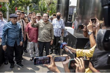Mantan Menteri Koordinator Bidang Maritim dan Sumber Daya Indonesia Rizal Ramli (kedua kanan) bersama Ketua Majelis Syuro Partai Ummat Amien Rais (kiri) yang tergabung dalam Koalisi Perbaikan Indonesia (KPI) berjalan untuk memberikan laporan kepada KPK di gedung KPK Merah Putih, Jakarta, Senin (21/8/2023). Pada laporannya, KPI mendesak KPK dan Kejaksaan Agung agar memberantas praktek Korupsi, Kolusi dan Nepotisme (KKN) serta praktek kejahatan keuangan lainnya. ANTARA FOTO/Muhammad Adimaja/hp.
