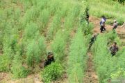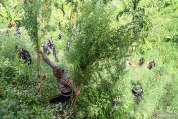 Personel gabungan Badan Narkotika Nasional (BNN) RI, TNI dan Polri mencabut tanaman ganja dalam operasi lanjutan pemusnahan ladang ganja di Desa Blang Manyak, Kecamatan Sawang, Aceh Utara, Aceh, Senin (21/8/2023). Dalam operasi itu petugas menemukan ladang ganja seluas 1,2 hektare dengan lebih dari 11.000 batang pohon ganja siap panen atau sekitar 5 ton yang kemudian dimusnahkan dengan cara dibakar. ANTARA FOTO/Rahmad/hp.
