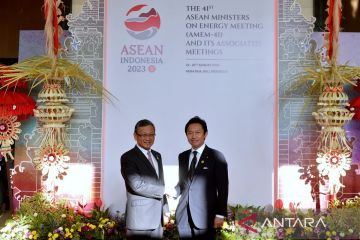 Menteri Energi dan Sumber Daya Mineral (ESDM) Arifin Tasrif (kiri) menyambut State Minister of Economy, Trade and Industry Jepang Shinichi Nakatani (kanan) saat pembukaan 41st ASEAN Ministers on Energy Meeting (AMEM-41) dan ASEAN Business Energy Forum (AEBF) di Badung, Bali, Kamis (24/8/2023). Pertemuan AMEM-41 dan AEBF 2023 itu diharapkan dapat berkontribusi terhadap investasi dan kerja sama pada tiga pilar di sektor energi negara-negara ASEAN yakni keberlanjutan, keamanan, dan interkonektivitas. ANTARA FOTO/Fikri Yusuf/tom.