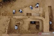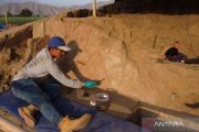 Sejumlah arkeolog membersihkan dinding dengan beragam bentuk dekorasi (polikrom) berusia 4.500 tahun yaitu bagian dari kuil periode zaman pra-keramik akhir, di Huaca Tomabal, Lembah Viru, Peru Rabu (23/8/2023). ANTARA FOTO/Feren Castillo/PAVI/Handout via Reuters/nym.