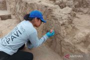 Seorang arkeolog membersihkan dinding dengan beragam bentuk dekorasi (polikrom) berusia 4.500 tahun yaitu bagian dari kuil periode zaman pra-keramik akhir, di Huaca Tomabal, Lembah Viru, Peru Rabu (23/8/2023). ANTARA FOTO/Feren Castillo/PAVI/Handout via Reuters/nym.