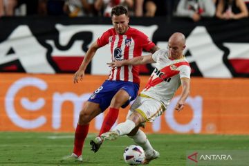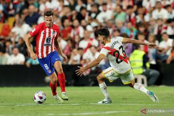 Pesepak bola Atletico Madrid Saul Niguez (kiri) berebut bola dengan pesepak bola Rayo Vallecano Oscar Valentin dalam laga Liga Spanyol, di Estadio de Vallecas, Madrid, Spanyol, Senin (28/8/2023). Atletico Madrid bantai Rayo Vallecano 7-0 tanpa balas. ANTARA FOTO/Reuters-Violeta Santos Moura/hp.