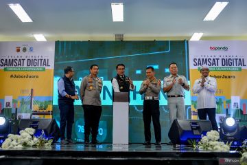 Gubernur Jawa Barat Ridwan Kamil (tengah) bersama Kakorlantas Polri Irjen Pol Firman Santyabudi (ketiga kanan) dan Direktur Utama Jasa Raharja Rivan A Purwantoni (kedua kanan) meresmikan Samsat Digital di Terminal Leuwipanjang, Bandung, Jawa Barat, Selasa (29/8/2023). Pemerintah Provinsi Jawa Barat bersama Jasa Raharja dan Korlantas Polri meresmikan Samsat Digital yang ditujukan guna memudahkan pembayaran pajak kendaraan bermotor dari semula dua jam menjadi dua puluh menit. ANTARA FOTO/Raisan Al Farisi/hp.