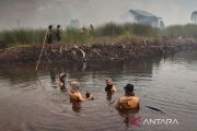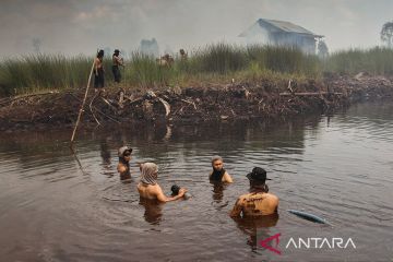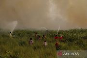 Satgas gabungan memadamkan api yang membakar hutan dan lahan di Kelurahan Patuk Katimpun, Palangka Raya, Selasa (29/8/2023). Petugas terus berupaya mengendalikan kobaran api yang membakar lahan gambut, dimana pemadaman terkendala cuaca panas dan lahan yang terbakar dalam kondisi kering. ANTARA FOTO/Auliya Rahman/Spt.