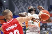 Pebasket Timnas basket Lebanon Ali Mansour (kiri) melanggar pebasket Timnas basket Pantai Gading Bazoumana Kone (kanan) saat pertandingan fase babak klasifikasi penentuan peringkat FIBA World Cup 2023 di Indonesia Arena, Gelora Bung Karno, Senayan, Jakarta, Kamis (31/8/2023). Timnas basket Lebanon berhasil mengalahkan Timnas basket Pantai Gading dengan skor 94-84. ANTARA FOTO/M Risyal Hidayat/nym.
