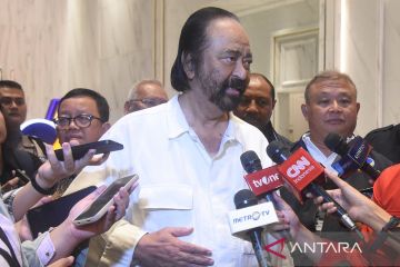 Ketua Umum Partai Nasdem Surya Paloh menjawab pertanyaan wartawan terkait pemilihan Ketua Umum Partai PKB Muhaimin Iskandar sebagai cawapres pasangan Anies Baswedan di Nasdem Tower, Jalan Gondangdia, Jakarta, Kamis (31/8/2023) malam. Selain menanggapi pemilihan Cak Imin sebagai cawapres pendamping Anies Baswedan, Surya Paloh juga memahami kekecewaan Partai Demokrat terkait keputusan tersebut. ANTARA FOTO/Indrianto Eko Suwarso/Spt.