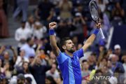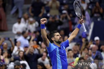 Petenis Serbia Novak Djokovic merayakan kemenangan usai menundukkan kompatriot Laslo Djere pada US Open di Flushing Meadows, New York, Amerika Serikat, Jumat (1/9/2023). Djokovic lolos ke babak 16 besar dan akan menghadapi petenis Kroasia Borna Gojo. ANTARA FOTO/REUTERS/Shannon Stapleton/rwa.