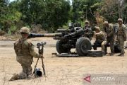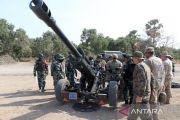 Tentara Amerika US Army menentukan sasaran bidik meriam Howitzer dalam Latihan Gabungan Bersama (Latgabma) Super Garuda Shield (SGS) 2023 di Pusat Latihan Pertempuran Marinir Baluran, Situbondo, Jawa Timur, Jumat (8/9/2023). Latihan tersebut selain untuk mengecek kesiapan senjata juga untuk berbagi pengetahuan dan strategi menembak menggunakan meriam agar tepat sasaran. ANTARA FOTO/Budi Candra Setya/tom.