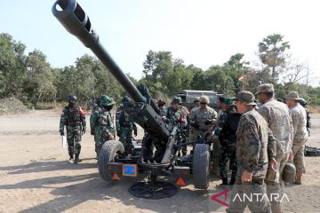 Prajurit korps Marinir TNI AL bersama tentara Amerika US Army berlatih menentukan sasaran bidik meriam Howitzer dalam Latihan Gabungan Bersama (Latgabma) Super Garuda Shield (SGS) 2023 di Pusat Latihan Pertempuran Marinir Baluran, Situbondo, Jawa Timur, Jumat (8/9/2023). Latihan tersebut selain untuk mengecek kesiapan senjata juga untuk berbagi pengetahuan dan strategi menembak menggunakan meriam agar tepat sasaran. ANTARA FOTO/Budi Candra Setya/tom.