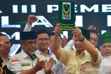 Ketua Umum Partai Gerindra Prabowo Subianto (kanan) memegang lambang Partai Bulan Bintang (PBB) bersama kader usai mendengarkan pembacaan komitmen bersama saat konsolidasi zona III di Padang, Sumatera Barat, Sabtu (9/9/2023). PBB menggelar konsolidasi zona III meliputi pulau Sumatera, Provinsi Banten dan DKI Jakarta untuk pemenangan pemilihan legislatif partai berlambang bulan dan bintang itu dan mewujudkan dukungan pemenangan Prabowo Subianto sebagai Calon Presiden 2024. ANTARA FOTO/Iggoy el Fitra/nym.