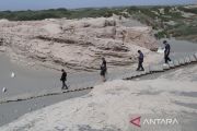 Wisatawan menuruni tangga saat mengunjungi sisa-sisa tembok kota kuno Suoyang di Gurun Gobi, Guazhou, Provinsi Gansu, China, Sabtu (9/9/2023). Kota tersebut pernah menjadi pusat administrasi, ekonomi, dan budaya yang makmur pada masa dinasti Tang dan Xia dengan populasi sekitar 50.000 orang, namun kemudian hancur pada sekitar abad ke-16. ANTARA FOTO/Desca Lidya Natalia/tom.