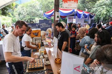 Pengunjung mengantre membeli makanan saat acara Pasar Belanda di Kompleks Erasmus Huis, Jakarta, Minggu (10/9/2023). Kedutaan Besar Kerajaan Belanda menggelar Pasar Belanda yang bertema Orange Goes Green dengan berbagai acara seperti bazar buku, produk kerajinan umkm, bazar makanan khas Belanda dan berfoto menggunakan kostum Belanda Volendam. ANTARA FOTO/Asprilla Dwi Adha/rwa.