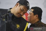 Menpora Dito Ariotedjo (kiri) berbincang dengan Ketua Umum PSSI Erick Thohir (kanan) usai penandatanganan kerja sama di Kantor Kemenpora, Jakarta, Selasa (12/9/2023). Pemerintah melalui Kemenpora memberikan bantuan kepada PSSI sebesar Rp399,5 miliar untuk pemusatan latihan nasional Timnas Indonesia U-17 dan penyelenggaraan Piala Dunia U-17 yang akan berlangsung pada 10 November - 2 Desember 2023. ANTARA FOTO/M Risyal Hidayat/Spt.