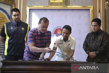 Menpora Dito Ariotedjo (kiri) bersama Ketua Umum PSSI Erick Thohir (kanan) menyaksikan Pejabat Pembuat Komitmen Asdep Olahraga Andalan Kemenpora Darmo Susilo (kedua kiri) dan Sekjen PSSI Yunus Nusi (kedua kanan) menandatangani naskah kerja sama di Kantor Kemenpora, Jakarta, Selasa (12/9/2023). Pemerintah melalui Kemenpora memberikan bantuan kepada PSSI sebesar Rp399,5 miliar untuk pemusatan latihan nasional Timnas Indonesia U-17 dan penyelenggaraan Piala Dunia U-17 yang akan berlangsung pada 10 November - 2 Desember 2023. ANTARA FOTO/M Risyal Hidayat/Spt.