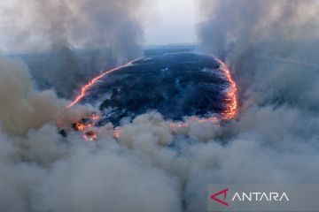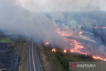 Foto udara api membakar lahan di sisi gerbang tol Rambutan Jalan Tol Trans Sumatera (JTTS) ruas Palembang-Indralaya di Desa Sungai Rambutan, Indralaya Utara, Ogan Ilir (OI), Sumatera Selatan, Kamis (14/9/2023). Derasnya angin di lokasi kebakaran lahan tersebut membuat petugas terkait kewalahan untuk memadamkan kebakaran. ANTARA FOTO/Nova Wahyudi/rwa.