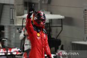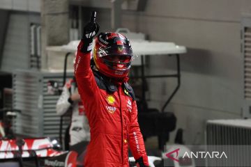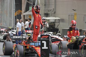 Pembalap Ferrari Carlos Sainz Jr. merayakan keberhasilannya meraih pole position usai sesi kualifikasi balapan F1 GP Singapura 2023 di Marina Bay Street Circuit, (16/9/2023). Carlos Sainz Jr. berhak start terdepan pada balapan tersebut diikuti pembalap Mercedes George Russell dan pembalap Ferrari Chales Leclerc. ANTARA FOTO/REUTERS/Edgar Su/aww.