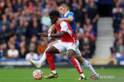 Pemain Arsenal Gabriel Martinelli berebut bola dengan pemain Everton Ashley Young pada laga Liga Inggris di Goodison Park, Liverpool, Inggris (17/9/2023). ANTARA FOTO/Action Images via Reuters/Lee Smith/aww