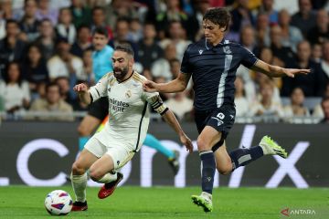 Pesepak bola Real Madrid Dani Carvajal i(kiri) berebut bola dengan pesepak bola Real Sociedad Robin Le Normand dalam laga lanjutan Liga spanyol, di Stadion Santiago Bernabeu, Madrid, Spanyol, Minggu (17/9/2023). Real Madrid berhasil mengalahkan Real Sociedad 2-1. ANTARA FOTO/Reuters/Isabel Infantes/hp.