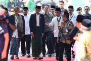 Presiden Joko Widodo (ketiga kiri) didampingi Rais Aam PBNU Miftachul Akhyar (kiri), Ketua Umum PBNU Yahya Cholil Staquf (kelima kiri), Menteri Agama Yaqut Cholil Qoumas (kedua kiri) tiba di lokasi Pembukaan Musyawarah Nasional Alim Ulama dan Konferensi Besar Nahdlatul Ulama 1445 H/2023 M di Pondok Pesantren Al-Hamid, Cipayung, Jakarta Timur, Senin (18/9/2023). Kegiatan yang diikuti oleh para kader NU tersebut mengangkat tema Mendampingi Umat Memenangi Masa Depan. ANTARA FOTO/Sigid Kurniawan/hp.