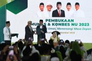 Presiden Joko Widodo (kedua kanan) menerima surat keputusan PBNU terkait pengukuhan Dewan Pengampu Gerakan Keluarga Maslahat NU dari Rais Aam PBNU Miftachul Akhyar (kedua kiri) disaksikan Istri Presiden ke-4 RI Abdurrahman Wahid (Gus Dur) Sinta Nuriyah (kanan) dan Ketua Umum PBNU Ketua Umum PBNU Yahya Cholil Staquf dalam Pembukaan Musyawarah Nasional Alim Ulama dan Konferensi Besar Nahdlatul Ulama 1445 H/2023 M di Pondok Pesantren Al-Hamid, Cipayung, Jakarta Timur, Senin (18/9/2023). Kegiatan yang diikuti oleh para kader NU tersebut mengangkat tema Mendampingi Umat Memenangi Masa Depan. ANTARA FOTO/Sigid Kurniawan/hp.
