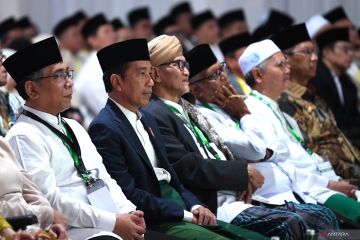 Presiden Joko Widodo menyampaikan pidato dalam Pembukaan Musyawarah Nasional Alim Ulama dan Konferensi Besar Nahdlatul Ulama 1445 H/2023 M di Pondok Pesantren Al-Hamid, Cipayung, Jakarta Timur, Senin (18/9/2023). Kegiatan yang diikuti oleh para kader NU tersebut mengangkat tema Mendampingi Umat Memenangi Masa Depan. ANTARA FOTO/Sigid Kurniawan/hp.