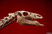 Tengkorak kerangka dinosaurus dewasa bernama Barry, spesimen besar Camptosaurus dari akhir periode Jurassic, kira-kira 150 juta tahun yang lalu, yang dilestarikan dengan baik dan salah satu tengkorak terlengkap yang pernah didokumentasikan untuk spesies tersebut, di pajang di Rumah lelang Drouot di Paris, Prancis, Selasa (12/9/2023). ANTARA FOTO/Reuters-Abdul Saboor/hp.