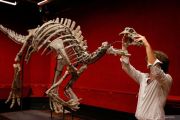 Pegawai rumah lelang Arthur merekonstruksi kerangka dinosaurus dewasa bernama Barry, spesimen besar Camptosaurus dari akhir periode Jurassic, kira-kira 150 juta tahun yang lalu, yang dilestarikan dengan baik dan salah satu tengkorak terlengkap yang pernah didokumentasikan untuk spesies tersebut, di Rumah lelang Drouot di Paris, Prancis, Selasa (12/9/2023). ANTARA FOTO/Reuters-Abdul Saboor/hp.