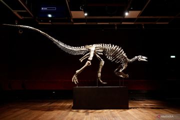 kerangka dinosaurus dewasa bernama Barry, spesimen besar Camptosaurus dari akhir periode Jurassic, kira-kira 150 juta tahun yang lalu, yang dilestarikan dengan baik dan salah satu tengkorak terlengkap yang pernah didokumentasikan untuk spesies tersebut dipajang, di Rumah lelang Drouot di Paris, Prancis, Selasa (12/9/2023). ANTARA FOTO/Reuters-Abdul Saboor/hp.