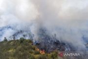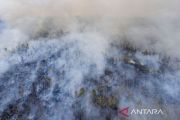 Foto udara api membakar lahan gambut di Pedamaran, Ogan Komering Ilir (OKI), Sumatera Selatan, Senin (18/9/2023). Balai Pengendalian Perubahan Iklim dan Kebakaran Hutan dan Lahan Wilayah Sumatera menerjunkan sembilan regu Manggala Agni dari Daops OKI, Lahat, Muba, Banyuasin dan Jambi untuk melakukan pemadaman kebakaran lahan gambut di wilayah tersebut. ANTARA FOTO/Nova Wahyudi/Spt.