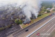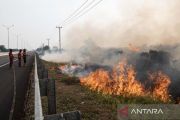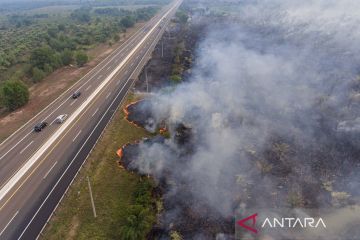 Api membakar lahan perkebunan kelapa sawit di sisi Jalan Tol Trans Sumatera (JTTS) ruas Palembang-Indralaya KM15 Palem Raya, Ogan Ilir (OI), Sumatera Selatan, Jumat (22/9/2023). Berdasarkan data dari satelit NASA-NOAA20 jumlah titik api di wilayah Indonesia sebanyak 3825 titik, sedangkan di Provinsi Sumatera Selatan terdapat 167 titik pada Jumat (22/9). ANTARA FOTO/Nova Wahyudi/aww.