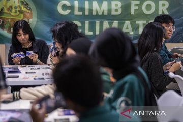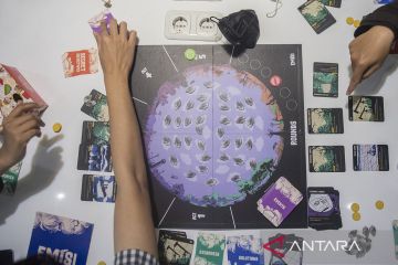 Mahasiswa bermain Board Game EMISI saat workshop edukasi solusi iklim di Bandung, Jawa Barat, Sabtu (23/9/2023). Aksi simpatik melalui permainan emisi ini bertujuan untuk memberikan edukasi dan simulasi kepada generasi muda untuk mengetahui teknologi solusi iklim dan mengambil keputusan yang tepat guna menghindari naiknya emisi dan menyelamatkan bumi dari bencana iklim. ANTARA FOTO/M Agung Rajasa/pras.