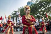 Penari menari saat aksi unjuk rasa dalam rangka Peringatan Hari Tani Nasional 2023 di Jakarta, Selasa (26/9/2023). Dalam aksinya merekan menyuarakan sejumlah tuntutan diantaranya membentuk dewan pertimbangan reforma agraria sebagai pengarah pelaksanaan reforma agraria sejati serta mendorong RUU Reforma Agraria dan mengesahkan RUU Masyarakat Adat. ANTARA FOTO/Muhammad Adimaja/foc.