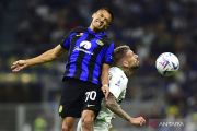 Pesepak bola Inter Milan Alexis Sanchez (kiri) berebut bola dengan pesepak bola U.S. Sassuolo Samu Castillejo dalam laga lanjutan Liga Italia, di Stadion San Siro, Milan, Italia, Rabu (27/9/2023). Sassuolo berhasil menumbangkan tuan rumah Inter Milan 2-1. ANTARA FOTO/ Reuters-Massimo Pinca/hp.