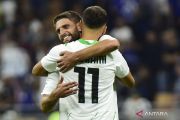Pesepak bola U.S. Sassuolo Nedim Bajrami dan Domenico Berardi melakukan selebrasi usai bertanding melawan Inter Milan dalam laga lanjutan Liga Italia, di Stadion San Siro, Milan, Italia, Rabu (27/9/2023). Sassuolo berhasil menumbangkan tuan rumah Inter Milan 2-1. ANTARA FOTO/ Reuters-Massimo Pinca/hp.
