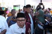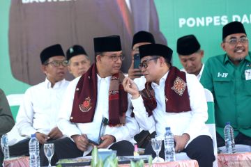 Bakal calon Presiden Anies Rasyid Baswedan (tengah) dan bakal calon Wakil Presiden Abdul Muhaimin Iskandar (kiri) menyapa pendukungnya di Pondok Pesantren Darussalam Blok Agung, Banyuwangi, Jawa Timur, Kamis (28/9/2024). Kunjungan tersebut merupakan pertama kalinya Anies dan Cak Imin bersafari politik ke pondok pesantren sejak pertama kali mendeklarasikan diri pada 2 September lalu. ANTARA FOTO/Budi Candra Setya/hp.