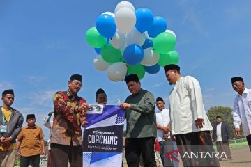 Ketua Umum PSSI Erick Thohir (tengah) menyerahkan bola kepada pengasuh Ponpes Bahrul Ulum KH Wafiyul Ahdi (ketiga kiri) saat pembukaan coaching academy di Lapangan Untung Suropati Tambakberas Jombang, Jawa Timur, Kamis (28/9/2023). Erick Thohir berharap dengan adanya coaching academy Bahrul Ulum Football Club muncul bintang-bintang sepak bola dari kalangan santri. ANTARA FOTO/Syaiful Arif/tom.