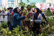 Sejumlah warga memilih bibit pohon gratis saat program Gotong Royong Boyong Pohon di Kawasan Bundaran HI, Jakarta, Minggu (1/10/2023). Kegiatan yang diselenggarakan oleh Kementerian BUMN tersebut membagikan sekitar 9.840 pohon secara gratis untuk mengajak masyarakat menanam pohon guna menekan permasalahan polusi udara di Jakarta. ANTARA FOTO/Asprilla Dwi Adha/foc.