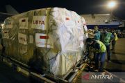 Petugas BNPB bersama petugas kargo bersiap memasukkan barang bantuan kemanusian ke pesawat untuk dikirim ke Libya di Terminal Kargo Bandara Soekarno-Hatta, Tangerang, Banten, Senin (2/10/2023). Pemerintah Indonesia memberikan bantuan kemanusian senilai Rp13,9 miliar, terdiri dari 27 barang bantuan seperti tenda, makanan siap saji, alat penyuling air dan lain-lain kepada Libya yang terkena banjir bandang akibat Badai Daniel. ANTARA FOTO/Muhammad Iqbal/Spt.