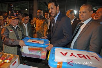 Plt Deputi Bidang Pemerataan Pembangunan dan Penanggulangan Bencana Kemenko PMK Sorni Paskah Daeli (kiri) secara simbolis menyerahkan bantuan kemanusian kepada Duta besar Libya untuk Indonesia Zakarya MM El Maghrabi (kedua kanan) sebelum diterbangkan ke Libya di Terminal Kargo Bandara Soekarno-Hatta, Tangerang, Banten, Senin (2/10/2023). Pemerintah Indonesia memberikan bantuan kemanusian senilai Rp13,9 miliar, terdiri dari 27 barang bantuan seperti tenda, makanan siap saji, alat penyuling air dan lain-lain kepada Libya yang terkena banjir bandang akibat Badai Daniel. ANTARA FOTO/Muhammad Iqbal/Spt.