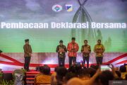 Menteri Desa, Pembangunan Daerah Tertinggal dan Transmigrasi Abdul Halim Iskandar (kiri) menyaksikan sejumlah kepala daerah membacakan deklarasi bersama Target Pengentasan Daerah Tertinggal di Palu, Sulawesi Tengah, Selasa (3/10/2023). Pemerintah melalui Kementerian Percepatan Pembangunan Daerah Tertinggal (PPDT) menargetkan pengentasan daerah tertinggal di Indoensia sebanyak 25 kabupaten di 2024 mendatang dari 62 kabupaten tertinggal yang tersisa saat ini. ANTARA/Basri Marzuki/hp.