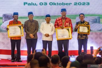 Wakil Presiden Ma'ruf Amin (tengah) didampingi Menteri Desa Pembangunan Daerah Tertinggal dan Transmigrasi Abdul Halim Iskandar (kedua kiri) foto bersama Gubernur Sulteng Rusdy Mastura (kiri), Gubernur Sumatera Barat Mahyeldi Ansharullah (kedua kanan) dan Bupati Sigi Mohamad Irwan Lapatta (kanan) usai menyerahkan piagam penghargaan pada pembukaan Rakornas Afirmasi Percepatan Pembangunan Daerah Tertinggal (PPDT) di Palu, Sulawesi Tengah, Selasa (3/10/2023). Rakornas yang diikuti sejumlah kepala daerah di seluruh Indonesia itu akan merumuskan program-program untuk mempercepat pengentasan daerah tertinggal di Indonesia, dengan target pada tahun 2024 sebanyak 25 kabupaten dari 62 daerah yang masih tersisa sesuai dengan Rencana Pembangunan Jangka Menengah Nasional (RPJMN). ANTARA/Basri Marzuki/hp.