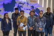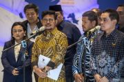 Menteri Pertanian Syahrul Yasin Limpo (ketiga kiri) didampingi jajaran pengurus partai memberikan keterangan pers di Kantor DPP Partai NasDem, Jakarta, Kamis (5/10/2023). Syahrul Yasin Limpo mengatakan kedatangannya di Polda Metro Jaya terkait kasus dugaan pemerasan oleh pimpinan KPK. ANTARA FOTO/Galih Pradipta/foc.