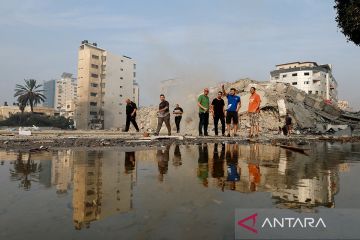 Warga Palestina memeriksa reruntuhan Menara Watan yang hancur akibat serangan Israel di Kota Gaza, Palestina, Minggu (8/10/2023). Israel merespon serangan roket yang diluncurkan Hamas dengan melakukan serangan udara hingga mengakibatkan 232 warga Palestina tewas. ANTARA FOTO/REUTERS/Ibraheem Abu Mustafa/Spt.