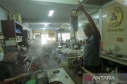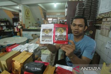 Seorang pekerja di warung kopi Solong memperlihatkan kemasan bubuk kopi robusta di kawasan Ulee Kareng, Banda Aceh, Aceh, Senin (9/10/2023). Warung kopi Solong didirikan pada 1974 oleh Muhammad Saman atau akrab disapa Abu Solong dan kini dikelola generasi kedua dengan tetap menyajikan kopi robusta khas Aceh secara tradisional untuk wisatawan lokal maupun mancanegara. ANTARA FOTO/Khalis Surry/aww.