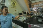 Pelayan warung kopi Solong menyiapkan kopi robusta dan sanger untuk pengunjung di kawasan Ulee Kareng, Banda Aceh, Aceh, Senin (9/10/2023). Warung kopi Solong didirikan pada 1974 oleh Muhammad Saman atau akrab disapa Abu Solong dan kini dikelola generasi kedua dengan tetap menyajikan kopi robusta khas Aceh secara tradisional untuk wisatawan lokal maupun mancanegara. ANTARA FOTO/Khalis Surry/aww.