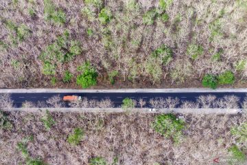 Foto udara kendaraan melintasi hutan jati yang mengering di Taman Nasional Baluran, Situbondo, Jawa Timur, Selasa (10/10/2023). TN Baluran mempunyai tipe ekosistem hutan musim atau mansoon forest seluas 5.600 hektar berupa hamparan hutan jati (tectona grandis) yang ketika musim kemarau daunnya berguguran. ANTARA FOTO/Budi Candra Setya/foc.